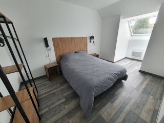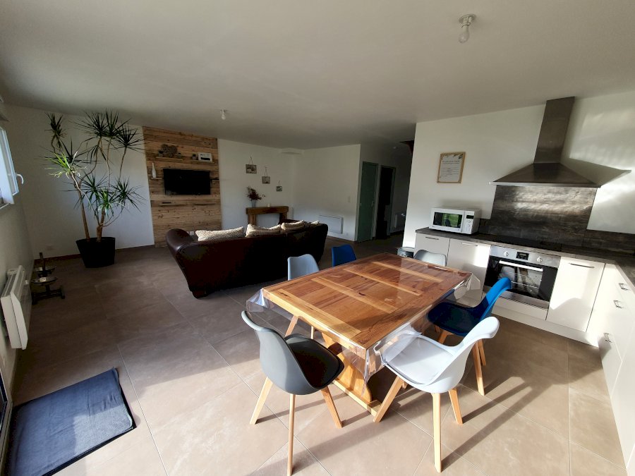 Une cuisine aménagée et équipée (cafetière Senseo, micro-onde, lave-vaisselle, four, hotte, etc) ouverte sur le séjour, une chambre (équipée d'un lit bébé) et une salle d'eau avec wc (équipée d'une machine à laver et d'un sèche linge)