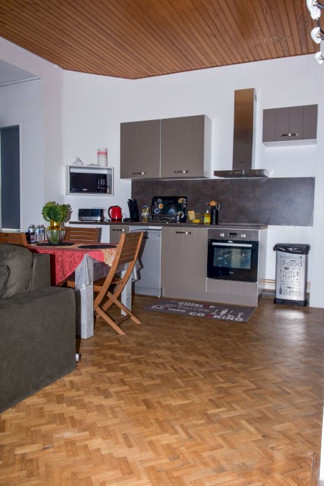 Cuisine équipée, une cafetière Senseo, une brouilloire, un frigo, un four à micro onde, un lave vaiselle une plaque induction avec four électrique.