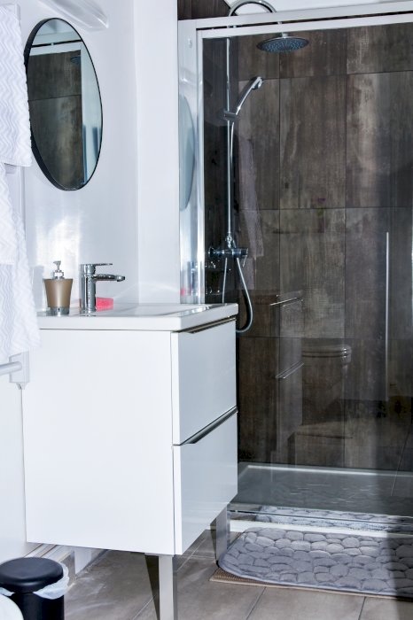 Le logement est équipée d'une chambre et un salon. Salle de bain avec douche sèche serviettes électrique et un lit double un canapé lit 3 place et un écran plat avec internet haute performance.