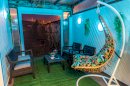 Véranda privé avec fauteuil suspendu, 4 chaises, une table et un jardin privé.