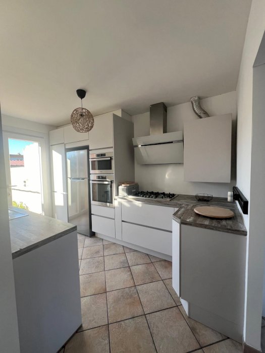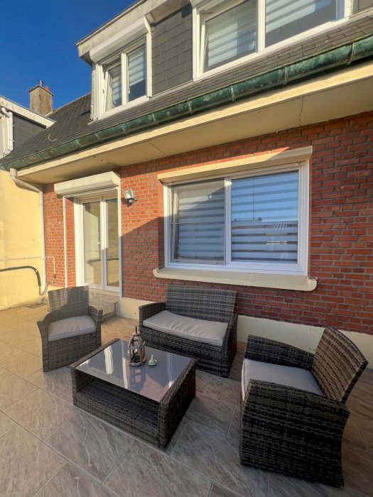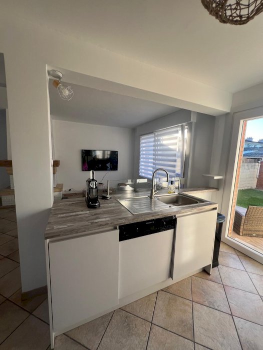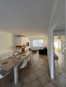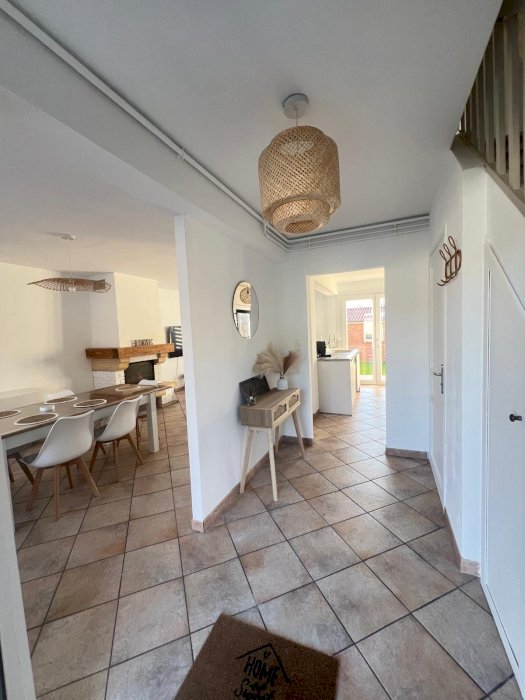Maison spacieuse et lumineuse de 110m2 avec son salon/salle à manger ouvert sur la cuisine aménagée et équipée.