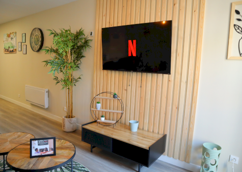Notre logement T2 comprend une grande pièce à vivre avec un lit double pour deux personnes ; une cuisine équipée avec lave-vaisselle, micro-ondes, grille-pain, réfrigérateur, bouilloire et machine à café ; une salle de bains pourvue d’une douche ; une machine à laver et télévision avec Netflix. Pour le second couchage, le canapé du séjour est convertible.
