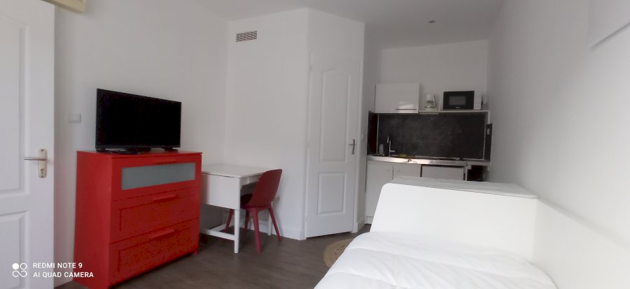 Ce studio rénové est MEUBLE et est composé d'un séjour avec cuisine équipée ouverte, d'un lit convertible pour 2 personnes et d'une salle de bain avec cabine de douche et WC.