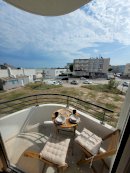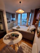 Petit studio de 20 m² avec vue mer, composé d'une pièce de vie avec cuisine aménagée et salle de douche séparée. Un balcon permet de profiter de la vue.