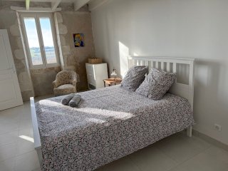 Longère charentaise juchée sur une crête surplombant l’Estuaire de la Gironde, "Air & Lumière" offre une vue panoramique sur les côteaux, le village, son château et son église romane, ainsi que sur l’estuaire et ses reflets d’argent.